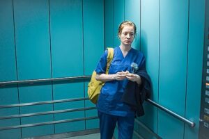 フロリア(レオニー・ベネシュ)は遅番としてシフトに入るけれど、それ以外にも早番の人と夜勤の人がいる。3交代制で1日を回しているということなのだろう。そうすると1勤務は約8時間ということになる。その間、フロリアはほとんど休みなく働いている。食事をとる暇もなかったのか、帰りのエレベーターの中でパンをかじったりしている。そんな激務が看護師の仕事なのだ。
